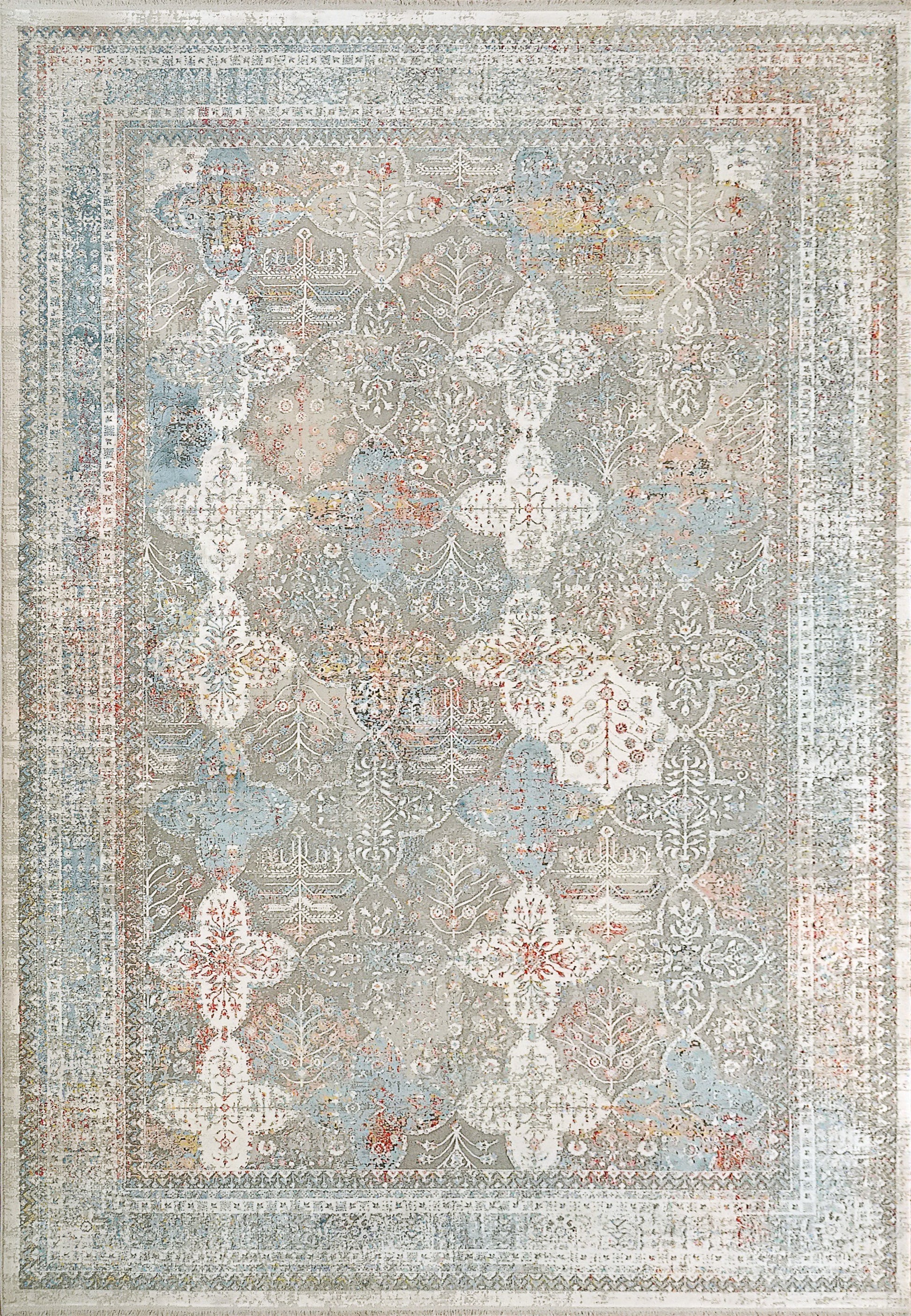 Ruby is made of Viscose and Shrink Acrylic, power loomed in Turkey. The construction and the intricacy of the design work give these rugs a true valuable handmade look with stunning traditional, abstract, and modern designs. The 2 million construction point creates a high-end look with soft hues of grey with pops of captivating blues and folds in its mosaic like texture.